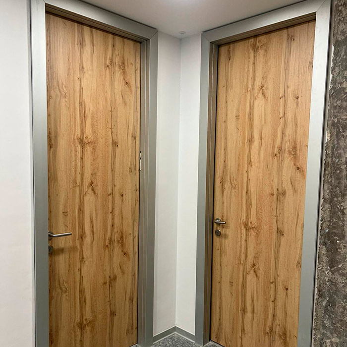Puertas en sistema block (listas para montaje en obra) o kit (desmontado) de chapa natural con perfiles de madera maciza o de DM con perfiles DM. Premarcos, casonetos para puertas correderas. Galces, tapetas, molduras en madera maciza.
